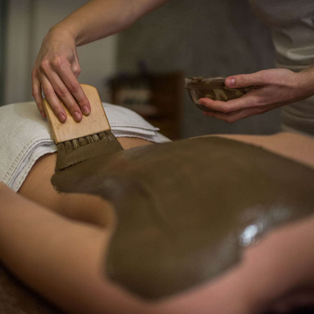 De achterkant van het lichaam wordt gescrubd en daarna met warme olie ingemasseerd.